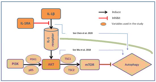 Postulated relationship between IL-1β/IL-1RA axis and autophagy signaling pathway in invasive bladder cancer. IL-interleukin, PIK3/AKT/mTOR—Phosphoinositidylinositol-3-Kinase/Proteinkinase B/mammalian Target of Rapamycin signaling pathway, PDK phosphoinositide-dependent protein kinase-1, TSC1/TSC2—Tuberous Sclerosis Complex 1 and 2, and p85—protein, the regulatory subunit of PI3K [,].