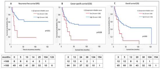 A–C: Kaplan-Meier diagrams for IL-1β expression: (A). recurrence-free survival, (B). cancer specific survival and (C). overall survival; red = expression <160, log rank test, below numbers at risk.