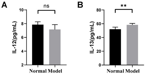 Changes in BALF inflammatory factors in guinea pigs. (A) Changes in interleukin 12 in BALF. (B) Changes in interleukin 13 in BALF. ** p < 0.01, compared to the normal group. The ns indicates that no statistical difference was observed between the two groups. Data are expressed as the mean ± SD (n = 6/group). The black column represents the normal group. The grey column represents the model group.