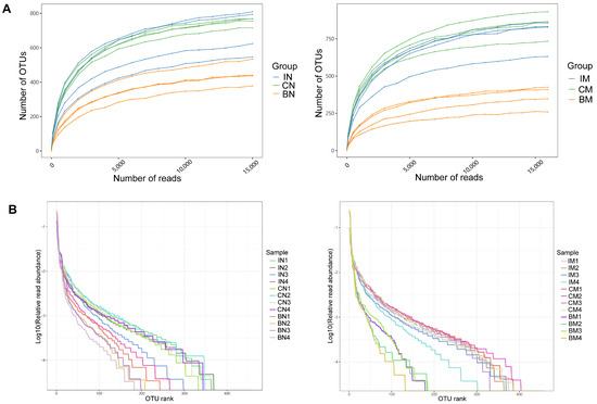 Rarefaction Curve and Rank−Abundance curve of all samples. (A) The Rarefaction Curve shows the trend of changes in species richness of each sample with sequencing depth. (B) The Rank−Abundance curve displays the relationship between the abundance of individual species and the number of individual species in each sample. IN (the microbiota in the ileum of the normal group), CN (the microbiota in the colon of the normal group), BN (the microbiota in the BALF of the normal group), IM (the microbiota in the ileum of the CVA model group), CM (the microbiota in the colon of the CVA model group), BM (the microbiota in the BALF of the CVA model group). Guinea pigs were randomly divided into a normal group and a model group, with six guinea pigs in each group. Sequencing analysis was conducted on four samples from each group.