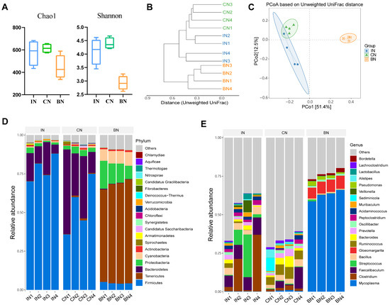 We analyzed the changes in the microbiota of the ileum between the normal group (IN) and the model group (IM). Calculation of the alpha diversity index showed a significant increase in Chao1 in the IM group compared to the IN group (p < 0.01). The Shannon index of the IM group was significantly higher than that of the IN group (p < 0.01, Figure 4A).