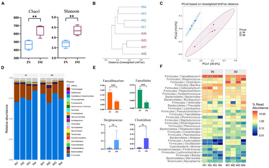 To further visualize the species data in the ileum samples, we conducted analysis at the phylum and genus levels (Figure 4D,F). The top five phyla represented in both the IN and IM groups were Firmicutes, Bacteroidetes, Proteobacteria, Cyanobacteria, and Actinobacteria, accounting for 94.71% and 94.23% of the total, respectively. Compared to the IN group, the relative abundance of Bacteroidetes and Cyanobacteria decreased, while that of Firmicutes, Actinobacteria, and Proteobacteria increased in the IM group, but none of these changes were significant. At the genus level, Faecalibaculum, Streptococcus, Clostridium, Bacillus, and Cellulosilyticum were dominant in both the normal and model groups. The abundance of Faecalibaculum and Faecalitalea was significantly lower in the IM group compared to the IN group (p < 0.001, Figure 4E), while the abundance of Streptococcus and Clostridium was higher in the IM group, but the differences were not significant (p > 0.04).