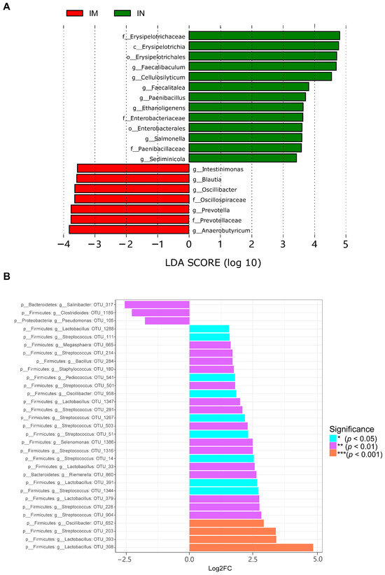 Differential species analysis of the gut microbiota in the ileum. (A) The horizontal axis represents the magnitude of the LDA score, where the length of the bar indicates the importance of the corresponding group. The color represents different groups, indicating that these groups have significantly enriched features, with the highest average abundance and significant differences between groups. (B) The positive values of the horizontal axis Log2FC represent up-regulated species, while negative values represent down-regulated species, and the vertical axis represents the taxonomic classification of the species, with three columns indicating phylum, genus, and OTU. The color represents the degree of significance.