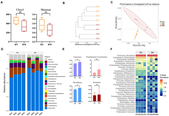 The data on species in the lungs were analyzed to further understand the distribution and composition of microbiota at the phylum and genus levels. At the phylum level, the two groups were mainly composed of Tenericutes, Proteobacteria, Cyanobacteria, Firmicutes, and Actinobacteria. Compared to the BN group, the BM group had a significantly higher abundance of Tenericutes, while other phyla did not show significant changes. It is worth noting that the proportion of Proteobacteria and Cyanobacteria increased in the BM group compared to the BN group (Figure 6E). At the genus level, the two groups were mainly composed of Mycoplasma, Gloeomargarita, Bordetella, Pseudomonas, and Helicobacter (Figure 6F). Compared to the BN group, the BM group had a significantly higher abundance of Mycoplasma (Figure 6E), but the increase in Bordetella was not significant.