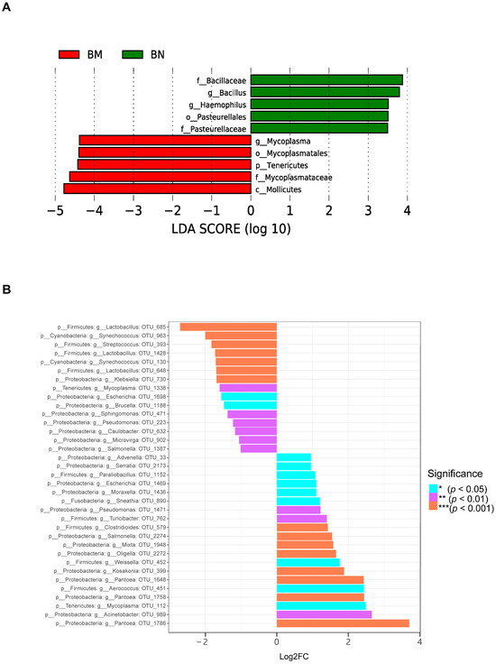 We also used LEfSe analysis to find biomarkers that are important and significantly different between the BN and BM groups. The results showed that Mycoplasma, Mycoplasmatales, Tenericutes, and Mycoplasmataceae were significantly different in BM (Figure 7A). Using the metagenomeSeq method, we identified 35 different microbial species that constituted 26 bacterial genera (Figure 7B). Among them, down-regulated species included Lactobacillus OTU_685, Streptococcus OTU_393, and Mycoplasma OTU_1338, while up-regulated species included Pantoea OTU_1786, Acinetobacter OTU_989, and Mycoplasma OTU_112.