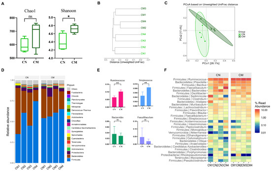 To assess the impact of CVA on the systematic evolutionary composition of colon microbiota, we compared the microbiota of CN and CM groups. The results of alpha diversity showed that the Chao1 index of the colon in the model group increased, with no significant difference in variation (p > 0.05), but the Shannon index significantly increased (p < 0.05, Figure 8A). The PCoA based on unweighted UniFrac distances showed that there was partial overlap in the confidence ellipses between the colon normal group and the model group (Figure 8C). Therefore, we further validated whether there were significant differences in sample distance between the CN and CM groups using PerMANOVA. The results showed that there was no significant difference between the CN and CM groups (R2 = 0.20955, p = 0.085 > 0.05).