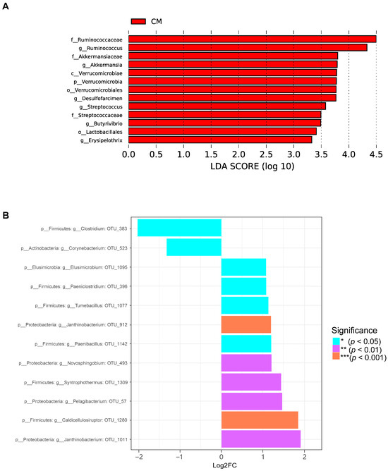 Subsequently, LEfSe analysis revealed the differentially enriched microbial genera in the CM group, including Ruminococcaceae, Ruminococcus, Akkermansia, and Streptococcus (Figure 9A). Using the metagenomeSeq method, we identified 12 different microbial species that constituted 11 microbial genera (Figure 9B). Among them, down-regulated species included Clostridium OTU_383 and Corynebacterium OTU_523, while up-regulated species included Janthinobacterium OTU_1011, Caldicellulosiruptor OTU_1280, and Pelagibacterium OTU_57.