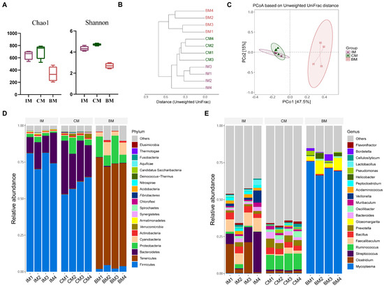 Comparison of microorganisms in three different niches in CVA model guinea pigs. (A) Alpha diversity. (B) Clustering tree based on unweighted UniFrac distances. (C) PCoA based on unweighted UniFrac. (D) Distribution of high-abundance microbial groups at the phylum level. (E) Distribution of high-abundance microbial groups at the genus level.