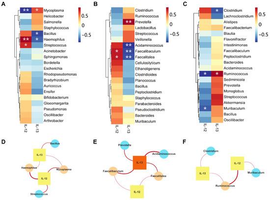 The correlation between microbiota and inflammatory factors. (A) Heat map showing the correlation between the top 20 abundant genera of pulmonary microbial communities and lung inflammatory factors. The redder the color, the stronger the positive correlation, while the bluer the color, the stronger the negative correlation. * p < 0.05, ** p < 0.01. (B) Heat map showing the correlation between the top 20 abundant genera of ileal microbial communities and lung inflammatory factors. (C) Heat map showing the correlation between the top 20 abundant genera of colonic microbial communities and lung inflammatory factors. (D) Network diagram depicting the correlation between the top 20 abundant genera of pulmonary microbial communities and lung inflammatory factors. Circular nodes represent microbial communities at the genus level, while square nodes represent inflammatory factors. The degree indicates the number of edges connected to the node, and a larger degree indicates that the species is more central in the network. The species point size is correlated with degree, the color of the smallest species point value is light blue−green, and the color of the largest selected species point value is light orange. The color with the smallest inflammatory factor score is pale yellow and the color with the largest inflammatory factor point value is orange. (E) Network diagram depicting the correlation between the top 20 abundant genera of ileal microbial communities and inflammatory factors. (F) Network diagram depicting the correlation between the top 20 abundant genera of colonic microbial communities and inflammatory factors.