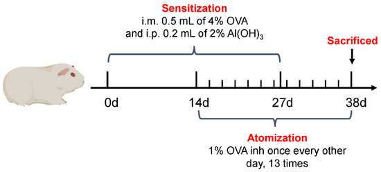 Guinea pigs were randomly divided into a normal group and a model group, with six guinea pigs in each group. After 10 days of adaptive feeding, the model group was sensitized with OVA and stimulated to prepare a CVA model (Figure 12), namely, intramuscular injection of 0.5 mL of 4% OVA solution on day 0 and day 27, and intraperitoneal injection of 0.2 mL of 2% Al(OH)3 suspension. The normal group was injected with the same amount of saline at the same time and by the same route. Starting from day 14, guinea pigs were placed in a 4 L sealed box and sprayed with 1% OVA solution at the maximum spray rate (3 mL/min) for 60 s, while the normal group was sprayed with physiological saline, inhaling once every other day, for a total of 13 times.