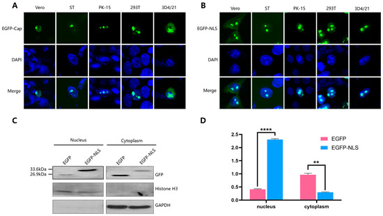 Moreover, the predicted NLS of the PCV4 Cap was linked to the egfsp gene of the pEGFP-N1 plasmid to obtain the recombinant eukaryotic expression plasmid pEGFP-NLS, followed by transfecting into Vero, ST, PK-15, HEK-293T, and 3D4/21 cells. As shown in Figure 1B, almost all of the green fluorescence was detected in the nucleus of the pEGFP-NLS-transfected group (EGFP-NLS), which is similar to the results of the fused protein EGFP-Cap in Figure 1A. Furthermore, the EGFP fused with the NLS was mainly distributed in the nucleus. At the same time, the EGFP without the NLS was primarily located in the cytoplasm (Figure 1C,D). These results further confirm that the PCV4 Cap contains an NLS, which may be critical for the Cap protein to enter the nucleus.