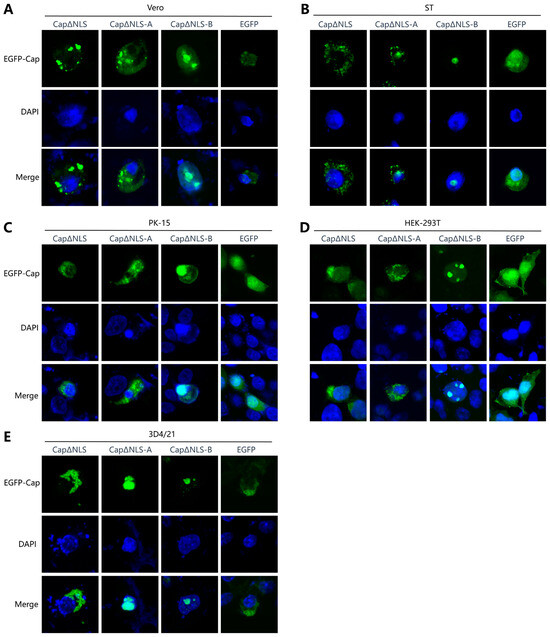 Expressions of different truncated Cap proteins in cells. Cells were transfected with plasmids pEGFP-N1, pEGFP-Cap∆NLS, pEGFP-Cap∆NLS-A, and pEGFP-Cap∆NLS-B, respectively, followed by laser confocal microscope evaluation (63×). (A) Vero cell. (B) ST cell. (C) PK-15 cell. (D) HEK-293T cell. (E) 3D4/21 cell.