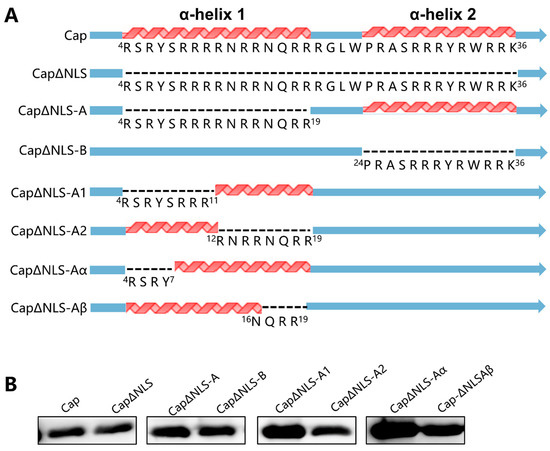 Since the NLS contains two α-helixes, the influence of the two α-helixes on the nucleus entry of the NLS was evaluated. The results show that the Cap protein could not enter the nucleus after the NLS (CapΔNLS) was removed entirely (Figure 2), which was contrary to the result when the NLS was preserved (Figure 1) and further confirms that the NLS is necessary for the Cap protein to enter the nucleus.