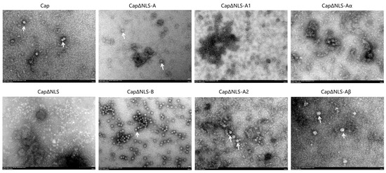 Since the Cap protein is the only structural protein of PCV, which can form an icosahedral capsid composed of 60 subunits of the PCV Cap [16,17], the influence of the PCV4 NLS and its truncated forms on the formation of virus-like particles was evaluated. As shown in Figure 3A, eight constructs of the PCV4 capsid with different truncated forms were constructed, followed by an expression evaluation of the protein. All the constructs can be effectively expressed in E. coil (Figure 3B).