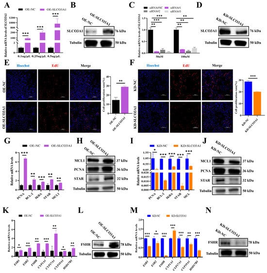 To investigate the impact of SLCO3A1 on the proliferation of GCs, empty plasmids (named OE-NC), overexpression plasmids of SLCO3A1 (named OE-SLCO3A1), small interfering RNA (siRNA) of NC (named KD-NC) and siRNAs of SLCO3A1 (named KD-SLCO3A1) were transfected into COV434 cells. The mRNA and protein levels of SLCO3A1 were significantly upregulated by OE-SLCO3A1 treatment compared to OE-NC (Figure 1A,B), and 0.5 ng/μL of OE-SLCO3A1 was chosen for subsequent experiments. We found that the mRNA and protein levels of SLCO3A1 were significantly reduced by KD-SLCO3A1 (siRNA#1, siRNA#2, siRNA#3) treatment compared to KD-NC (Figure 1C,D) in the GCs. And we used 50 nM of siRNA#3 for subsequent experiments. The 5-Ethynyl-2′-deoxyuridine (EdU) results showed that the proliferation rate of GCs was significantly increased by OE-SLCO3A1 treatment compared to OE-NC (Figure 1E), but it was significantly decreased by KD-SLCO3A1 treatment compared to KD-NC (Figure 1F). The mRNA and protein levels of proliferation-related genes (e.g., MCL1, PCNA, and STAR) were increased by OE-SLCO3A1 treatment compared to OE-NC. (Figure 1G,H). Meanwhile, the mRNA and protein levels of MCL1, PCNA, and STAR were decreased by KD-SLCO3A1 treatment compared to KD-NC (Figure 1I,J). Moreover, the mRNA and protein levels of FSHR were significantly increased by OE-SLCO3A1 treatment compared to OE-NC (Figure 1K,L), while the opposite result was found by KD-SLCO3A1 treatment (Figure 1M,N). These results suggested that SLCO3A1 promoted the proliferation of GCs.