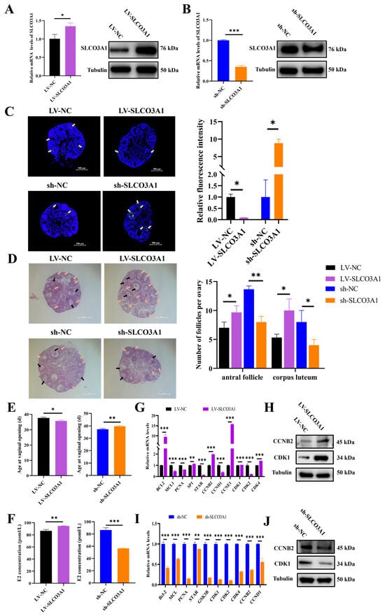 To further validate the role of SLCO3A1 in ovarian follicular growth, LV-NC, LV-SLCO3A1, sh-NC, or sh-SLCO3A1 were injected into the mice. Compared to LV-NC, the mRNA and protein levels of SLCO3A1 were elevated by LV-SLCO3A1 treatment (Figure 4A), while they decreased by sh-SLCO3A1 (Figure 4B). The terminal deoxynucleotidyl transferase mediated dUTP nick-end labeling (TUNEL) showed lower green fluorescence intensity with LV-SLCO3A1 treatment compared to LV-NC, but the fluorescence was higher with sh-SLCO3A1 treatment (Figure 4C). The hematoxylin and eosin (HE) staining showed that the number of antral follicles and corpus luteum were increased by LV-SLCO3A1 treatment compared to LV-NC, while this number was decreased by sh-SLCO3A1 treatment compared to sh-NC (Figure 4D). A previous study shows that the vaginal opening indicates that mice are in the estrus stage [], and the age of mice at vaginal opening was earlier by LV-SLCO3A1 treatment compared to LV-NC, but it was significantly delayed by sh-SLCO3A1 treatment compared to sh-NC (Figure 4E). The E2 level was significantly elevated by LV-SLCO3A1 treatment compared to LV-NC, while it was significant inhibited by sh-SLCO3A1 treatment compared to sh-NC in serum (Figure 4F). The mRNA and protein levels of CCNB2 and CDK1 were increased by LV-SLCO3A1 treatment compared to LV-NC (Figure 4G,H), while they declined by sh-SLCO3A1 treatment (Figure 4I,J). These results suggested that SLCO3A1 promoted the follicular maturation and eventually facilitated the ovulation and luteinization by inhibiting the apoptosis of GCs and promoting the secretion of E2 in mice.