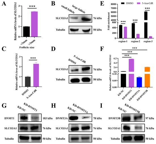 Knockdown of DNMT1 upregulates the mRNA and protein levels of SLCO3A1. (A) RT-qPCR analysis of SLCO3A1 expression in the small (<3 mm in diameter) and large (>3 mm in diameter) follicles. (B) Western blot analysis of SLCO3A1 in the small and large follicles. (C) RT-qPCR analysis of SLCO3A1 expression in the DMSO or 5-Aza-CdR treated-cells. (D) Western blot analysis of SLCO3A1 in the DMSO or 5-Aza-CdR treated-cells. (E) Chromatin accessibility assay of region-1, region-2, and region-3 in the SLCO3A1 promoter treated with DMSO or 5-Aza-CdR (region-1, +971/+1252 bp, region-2, +1433/+1557 bp, and region-3, +1623/+1831 bp, transcription start site = +2000 bp). (F) RT-qPCR analysis of SLCO3A1 expression in GCs transfected with siRNAs of DNMT1, DNMT3A, or DNMT3B. Western blot analysis of SLCO3A1, DNMT1 (G), DNMT3A (H), and DNMT3B (I) in the siRNAs of DNMT1, DNMT3A, or DNMT3B treated-cells. *** p < 0.001.