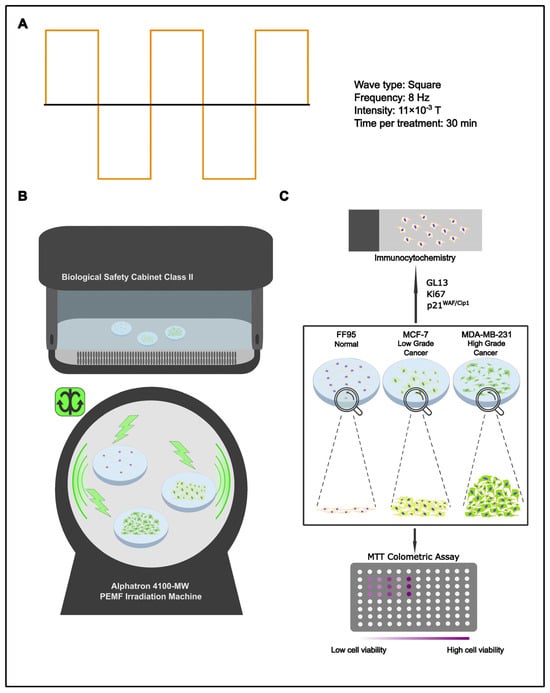 Tumor complexity restricts therapeutics to a handful of generalized, non-invasive approaches. Chemo-/radiotherapy are two of the most established strategies in the anti-cancer arsenal; they are, however, far from flawless. Their mercurial nature, although effective against cancer cells, has proven equally harmful towards the normal surrounding tissue. In spite of cancer’s unpredictable behavior/outcome, what the pathology gains in numbers through enhanced proliferating rates it lacks in stability and cellular component integrity. This key characteristic could be utilized in order to identify the break-point at which a therapeutic approach could be detrimental against cancer but at the same time harmless towards non- pathological cells. Since high-energy/short-wavelength radiation (radiotherapy) has deleterious effects on normal cells, the effect of low-energy/high-wavelength radiation may provide an alternative, less harmful treatment option. Hence, various pre-set programs of the Alphatron machine were put to the test. Data collected from these experiments led to the development of a manual PEMF irradiation program that consists of a frequency of 8 Hz, a wave type of full square, magnetic flux density of 0.011 T and a duration of 30 min two times per day for 5 consecutive days (Table 1) (Figure 1A). Since breast cancer is the most common cancer type in women overall [], the corresponding low-grade (MCF-7) and high-grade (MDA-MB-231) cell lines, along with normal fibroblast cells (FF95), were selected in the current study. For each cellular type, the same groups of cells were PEMF-irradiated or remained in the laminar flow hood as the non-treated control (Figure 1B). With the aforementioned aim in mind, the experiment was conceptualized to investigate the in vitro effects of PEMFs on cell viability, proliferation rate and the induction of cellular senescence in breast cancer cells and normal fibroblasts (Figure 1C).
