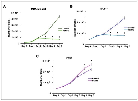 To test the effect of PEMFs on the proliferation rate, each cell line was seeded accordingly, in order not to exceed 70–85% confluency by the end of the 5 days of PEMF treatment. Cell culture medium was replaced on the third day. To facilitate cell counting, approximately 400,000 cells/Petri dish were seeded for MCF-7 and FF95, while for MDA-MB-231, the seeded number of the cells was 250,000 cells/Petri, since they are more proliferative than MCF-7 and FF95. For each cell line, two different groups of samples were tested, the PEMF-treated cells and the control group. The latter remained in the laminar hood without undergoing PEMF treatment. Following everyday treatment, cells from both groups were counted. Trypan Blue staining and cell counting (Neubauer, Corning, The Netherlands) using a hemocytometer and optical microscope (OLYMPUS IM, Olympus Deutschland GmbH, Hamburg, Germany) was performed every 24 h to obtain the proliferation rate curves [].