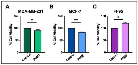 Cell viability was measured by the MTT colorimetric assay in all PEMF-treated and control cellular systems. Notably, we found decreased levels in the viability of breast cancer cells; particularly, 10% and 16% reductions were observed in MDA-MB-231 and MCF-7, respectively (Figure 3A,B). Interestingly, the corresponding results in FF95 cells indicated not only a non-cytotoxic effect in cell viability but also a 20% significant increase in it (Figure 3C). The latter finding in combination with the decreased proliferation rate of FF95 cells revealed another aspect of PEMFs that could be advantageous in the field of surgery regarding tissue repair and wound healing []. Particularly, the observed increased cell viability of fibroblasts induced by PEMFs could prove useful for post-operation due to the boost in their regenerative capacity.