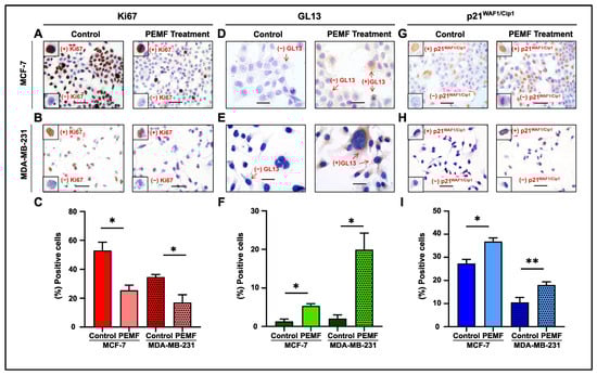 In this report, PEMF application demonstrated a decrease in proliferation, as indicated by the reduced Ki67 expression, in MCF-7 and MDA-MB-231 cells compared to controls (Figure 4A,B). Quantification analysis revealed a statistically significant equal decrease in Ki67 in both cancer cell lines (Figure 4C). Moreover, this treatment increased senescence, as assessed by GL13 and p21WAF/Cip1 staining in MCF-7 and MDA-MB-231 cells compared to the corresponding untreated cells (Figure 4D–I). Results showed that this statistically increased levels of cellular senescence following PEMF irradiation was only in the irradiated cells. In accordance with the previously proposed algorithm, GL13 overlapped with p21WAF1/Cip1 staining and exhibited a mutually exclusive pattern with Ki67 [].