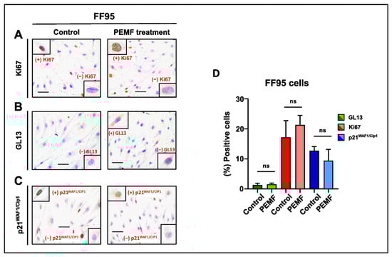 Evaluation of proliferation and cellular senescence in normal fibroblasts (FF95) following PEMF treatment. Representative images of Ki67 (A), GL13 (B) and p21WAF1/Cip1 (C) immunocytochemical staining. Ki67 and p21WAF1/Cip1 positivity was determined by evaluating the strong brown nuclear signal. GL13 staining exhibited a strong brown perinuclear and/or cytoplasmic signal. (D) Graph depicting the percentage of positive cells (%) for Ki67, GL13 and p21WAF1/Cip1 in PEMF-treated and control cells. Approximately 100 cells per optical field were counted, and ≥5 high-power fields per sample were used for the quantification. Statistical analysis was performed employing the Wilcoxon nonparametric test. The obtained data represent means ± standard deviation from four experiments. ns: non-significant. Objective 20×. Scale bar: 30 μm.