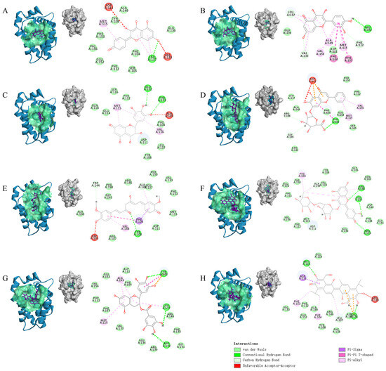 | Quercetin | 11 | Phe112, Val133, Leu137, Glu152 | Leu137, Glu136, Asp111, Val133, Phe112 | Phe104, Met115, Val133, Leu137, Ala149, Phe153, Val156 | −27.72 |