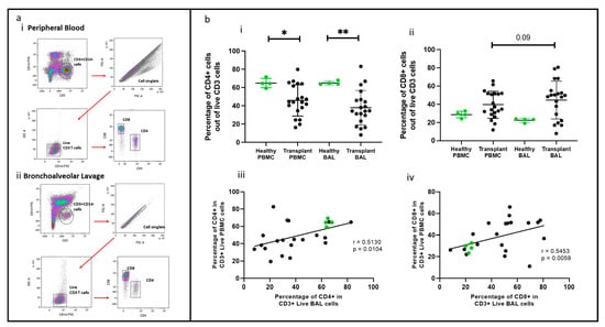 CD4+ and CD8+ T cells were identified using the gating strategy depicted in Figure 1. CD4+ cells were more abundant in the healthy cohort than in the transplant cohort in PBMC (p = 0.045) and BAL (p = 0.007). Conversely, CD8+ T cell proportions showed no significant difference between PBMC and BAL in either cohort (Figure 1b(i,ii)). Proportions of CD4+ and CD8+ T cells among CD3+ cells in PBMC correlated with their counterparts in BAL (r = 0.513, p = 0.010 and r = 0.545, p = 0.006) (Figure 1b(iii,iv)). We next compared absolute PBMC CD3+CD4+ cell numbers for healthy (n = 4, median = 252 ± 121) cells/μL of blood) and the transplant cohort (n = 20, median = 391 ± 416) cells/μL of blood and found no differences (Mann–Whitney U Test, p = 0.851). Similarly, absolute PBMC CD3+CD8+ cell numbers for healthy (n = 4, median = 116, SD= 72) cells/μL of blood) and the transplant cohort (n = 20, median= 391, SD= 416) cells/uL of blood were similar (Mann–Whitney U Test, p = 0.114). Given the absence of substantial variances in T cell quantities in the bloodstream between the healthy and transplant groups, alongside challenges in acquiring absolute counts from bronchoalveolar lavage, comparisons were conducted based on cellular proportions in subsequent analyses.