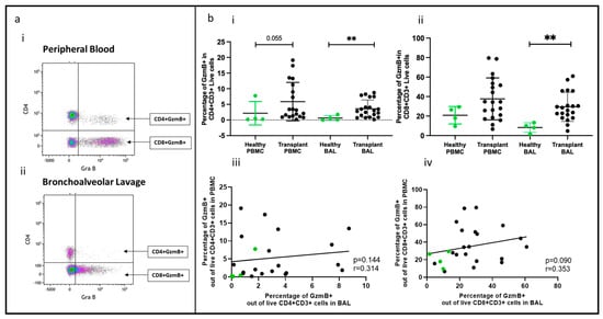 Effector T cells expressing granzyme B, a crucial enzyme involved in acute rejection mediated by T cells, were identified, as shown in Figure 2a(i,ii). The proportions of CD4+granzyme B+ T cells and CD8+granzyme B+ T cells (out of CD4+ and CD8+ cells, respectively) were higher in the BAL of transplant recipients than in healthy controls (p = 0.0072, p = 0.0023), but no significant difference was observed in PBMC between the two groups (transplant vs. healthy) (Figure 2b(i,ii)). Notably, there was no correlation between the proportions of CD4+ or CD8+ cells in PBMC and their counterparts in BAL (Figure 2b(iii,iv)).