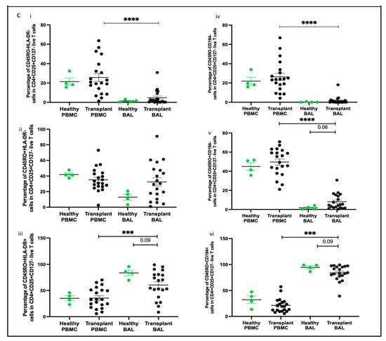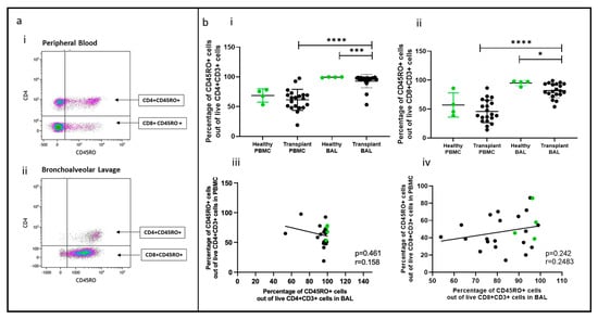 Memory T cell populations in PBMC and BAL were analyzed based on CD45RO expression, as shown in Figure 3a(i,ii). Proportions of CD45RO+CD4+ and CD45RO+CD8+ T cells were higher in transplant BAL than in PBMC (p < 0.0001, p = 0.0008). In comparison to healthy participants, memory CD4+ and CD8+ T cells were reduced in transplant BAL (p = 0.0125, p = 0.023) (Figure 3b(i,ii)). No significant difference was observed between healthy BAL and PBMC for either CD4+ or CD8+ memory T cells, and there was no correlation between memory cell proportions in PBMC and paired BAL (Figure 2b(iii,iv)).