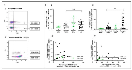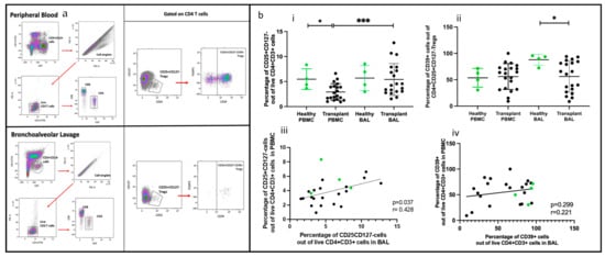 Of the two populations, Tregs (CD4+CD25+CD127−) were more abundant in transplant BAL than in PBMC (p = 0.0006) (Figure 5b(i,ii)). Activated Tregs (CD25+CD127−CD39+) proportions were similar in BAL and PBMC, but they were higher in the BAL of healthy participants than in the transplant group (p = 0.023). Paired PBMC and BAL CD4+CD25+CD127− Tregs showed a positive correlation (p = 0.037, r = 0.428), but not CD4+ CD25+CD127−CD39+ Tregs (Figure 5b(iii,iv)).