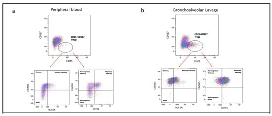 We further classified Tregs (CD4+CD25+CD127−) into subpopulations based on the expression of the CD45RO memory marker, HLA-DR (indicative of antigen experience), and CD194 (associated with migratory and tissue-resident characteristics). Representative flow cytometry plots illustrating these Treg subpopulations in peripheral PBMC mononuclear cells (PBMC) and bronchoalveolar lavage (BAL) are presented in Figure 6a,b.