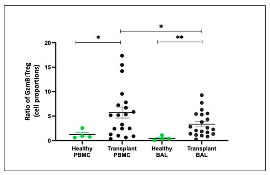 Granzyme B–Treg Ratio Between Healthy and Transplant (GZMB- Granzyme B). The ratio of CD8+GZMB+ T cell proportion to CD4+CD25+CD127− Treg proportion between healthy and transplant cohorts in BAL and PBMC. * p ≤ 0.05; ** p ≤ 0.01.