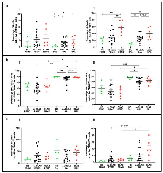 We examined effector T cells (Teffs) and memory T cells (Tmems) in participants stratified into three groups: ‘healthy control’ (HC: n = 4), ‘no CLAD’ (unaffected by CLAD: n = 14), and ‘CLAD’ (affected by CLAD: n = 6), comparing differences in cell proportions. In BAL, proportions of CD4+ and CD8+ Teffs (granzyme B+) were higher in both CLAD (p = 0.019, p = 0.0095) and no CLAD (p = 0.018, p = 0.0078) groups compared to the healthy group (Figure 8a(i,ii)). In PBMC, proportions of CD8+ Teffs were higher in the CLAD group than in the healthy group (p = 0.0046) (Figure 8a(ii)).