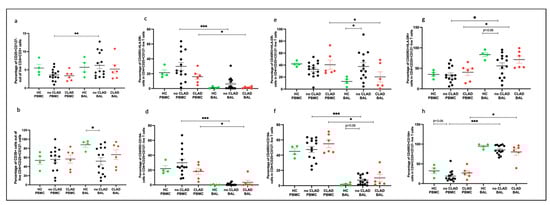 Tregs comparing groups. (a) Conventional Tregs (CD4+CD25+CD127−); (b) CD39+ Tregs; (c) naïve Tregs (CD45RO+HLA-DR+); (d) non-migratory naïve Tregs (CD45RO−CD194−); (e) memory Tregs (CD45RO+HLA-DR−); (f) non-migratory memory Tregs (CD45RO+CD194−); (g) memory activated Tregs (CD45RO+HLA-DR+); (h) migratory memory Tregs (CD45RO+CD194+). * p ≤ 0.05; ** p ≤ 0.01; *** p ≤ 0.001.