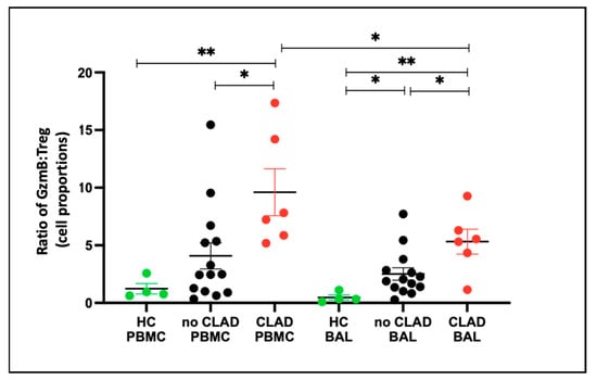 To gain insight into the balance of granzyme B and Treg cells under different conditions, we evaluated the granzyme B–Treg ratio for each group. In PBMCs, the granzyme B–Treg ratio was higher in the CLAD group compared to the healthy control (HC) group (p = 0.0095) and lower in the no CLAD group than in the CLAD group (p = 0.015). Conversely, in BAL, the granzyme B–Treg ratio was higher in both the CLAD (p = 0.0001) and no CLAD (p = 0.012) groups than in HC. Moreover, CLAD BAL exhibited a higher ratio than no CLAD BAL (p = 0.041) (Figure 10).