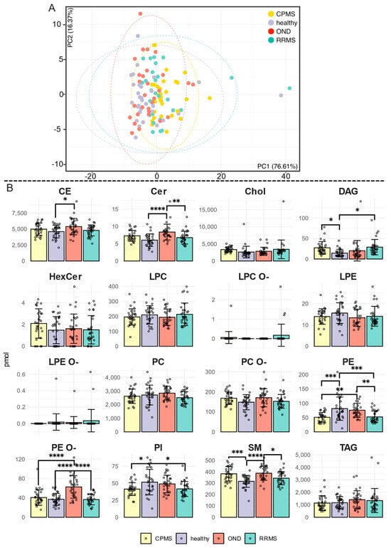 (A) Principal Component Analysis (PCA) plot illustrating the lipid subspecies distribution from 120 participants. The variance explained by PC1 is 76.61% and PC2 is 13.79%. Ellipses represent the 95% confidence intervals for each cohort. (B) Bar chart illustrating the concentration [pmol] with SD for the 16 lipid classes. Statistical significance was determined by a one-way ANOVA, followed by the TUKEY-HSD: * = p-value < 0.05; ** = p-value < 0.01; *** = p-value < 0.001; **** = p-value < 0.0001 (Supplementary Table S3).