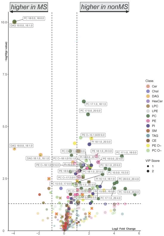 Volcano plot showing the differences in lipid subspecies in subjects without MS (healthy and OND) vs. subjects with MS (RRMS and CPMS). Colors represent lipid class classification. The size of the dots is determined by the VIP score from the comparative oPLS-DA (Supplementary Figure S7A). Lipids marked with red × have a high correlation with age and BMI (Supplementary Figure S6). The horizontal dashed line indicates a p-value of 0.05 in the Welch’s t-test. The vertical dashed line indicates a log2 fold change of 1. Only lipids with a p-value < 0.01 and a log2 fold change > 1.5 and no relevant correlation with age and BMI were annotated.