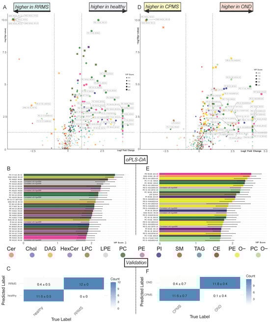 Volcano plot showing the differences in lipid subspecies in healthy subjects vs. patients with RRMS (A) and subjects with OND vs. CPMS (D). Colors represent lipid class classification. Lipids marked with red × have a high correlation with age and BMI (Supplementary Figure S6). The horizontal dashed line indicates a p-value of 0.05 in the Welch’s t-test. The vertical dashed line indicates a log2 fold change of 1. Only lipids with a p-value < 0.01 and a log2 fold change > 1.5 and no relevant correlation with age and BMI were annotated. The size of the dots is determined by the VIP score from the oPLS-DA (B,E). (B) Bar chart displaying the lipids with the top 30 VIP scores with SD of oPLS-DA healthy vs. RRMS (Supplementary Figure S8). (E) Bar chart displaying the lipids with the top 30 VIP scores with SD of oPLS-DA OND vs. CPMS (Supplementary Figure S8). Colors in (B,E) represent lipid class classification. Lipids with a high correlation with age and BMI are greyed out and annotated. Confusion matrix of the oPLS-DA of healthy vs. RRMS (C) and OND vs. CPMS (F) on the 40% hold out test dataset (testing data) ensuring the predictive capability of the important lipids provided by the oPLS-DA.