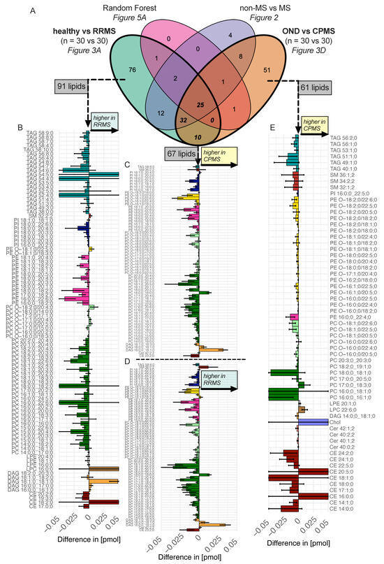 Cohort-Specific Significantly Altered Lipids. (A) Venn-Diagram illustrating the overlaps in the significantly altered lipids across three comparative analyses using oPLS-DA and Volcano: “healthy vs. RRMS (Figure 3A)”, “non-MS vs. MS (Figure 2)” and “OND vs. CPMS (Figure 3D)” and the Random Forest machine learning classification “non-MS vs. MS (Figure 5A)”. By analyzing the overlaps presented in the Venn diagram, it becomes evident which lipid alterations are specific to individual cohorts. This overlap-based approach enables a precise identification of cohort-specific lipidomic signatures. The individual lipids of these signatures are shown in (B–E). (B) Represents the signature for the RRMS cohort. (C,D) Illustrate the common overlap of lipids that are altered regardless of MS progression. (E) Represents the signature for the CPMS cohort. The horizontal bar plots detail the absolute difference amount within the range of −0.05 to 0.05 pmol (mean differences beyond this range truncated) along with their 95% confidence intervals.