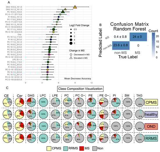 To further validate the patterns discovered by the volcano plot and oPLS-DA (Figure 2 and Figure 3A,C) and explore the predictive capability, we employed an RF model to classify MS and non-MS samples. RF, as a non-linear machine learning technique, offers the ability to capture complex patterns that linear methods, like oPLS-DA, might not fully elucidate []. Therefore, previous studies in lipidomics have shown that it is advisable to use multiple machine learning approaches [,,]. To generate a more parsimonious model, lipids with high correlations to BMI and age were removed and a multicollinearity filter was applied to further eliminate lipids with substantial inter-correlations. The model was trained on 60% of the data, tested via a 5-fold cross-validation and predicted the remaining 40% of the data. After 20 iterations, the model achieved an area under the curve (AUC) of 1 in the ROC for discriminating between MS and non-MS samples (Supplementary Figure S9). Therefore, across all iterations, the model correctly classified all 24 MS patients (Figure 5B). However, these findings, while encouraging, warrant caution due to potential overfitting and the need for further validation with a larger, independent cohort. Interestingly, 25 out of the 30 most important lipids from the RF (Figure 5A) were revealed to be also significantly altered in the volcano/oPLS-DA approach, proving that the patterns presented here (Figure 4B–E) possess high specificity and sensitivity across 120 participants and thereby accurately reflect a distinct plasma lipid profile in PwMS. This demonstrates the predictive power of a lipid pattern as a diagnostic tool.