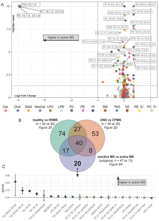 Differences in lipid compositions in inactive MS vs. active MS. (A) Volcano plot showing the differences in lipid subspecies in patients with inactive MS vs. patients with active MS. Colors represent lipid class classification. Lipids marked with red × have a high correlation with age and BMI (Supplementary Figure S6). The horizontal dashed line indicates a p-value of 0.05 using the Welch’s t-test. The vertical dashed line indicates a log2 fold change of 1. Only lipids with a p-value < 0.0001 and no relevant correlation with age and BMI were annotated; (B) comparing the overlaps of significantly altered lipids from the prior comparative analyses of “healthy vs. RRMS (Figure 3A)” and “OND vs. CPMS (Figure 3D)” to “inactive MS vs. active MS (A)”. We identified 20 lipids that are significantly altered only in patients with active MS. (C) Illustrates these significantly altered lipids by presenting the differences in pmol with SD.