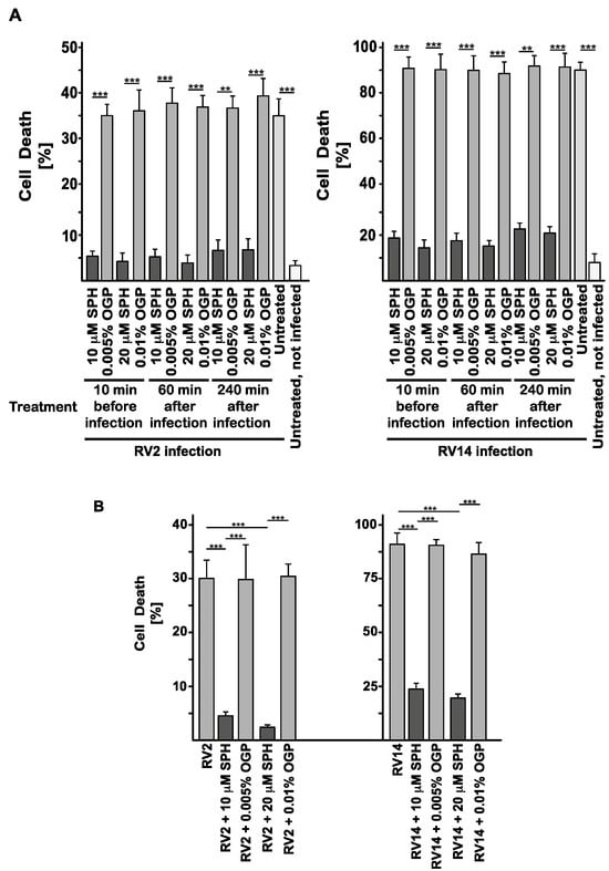 Sphingosine prevents the infection of human epithelial cells with rhinoviruses. (A) We infected 5 × 105 HeLa cells for 4 days with 105 plaque-forming units (PFU) each of rhinovirus strains RV2 (minor strain) or RV14 (major strain) in the presence or absence of 10 μM or 20 μM sphingosine (SPH), which was added either 10 min before infection with rhinoviruses or 60 min or 240 min after infection. Controls were either 0.005% or 0.01% octylglucopyranoside (OGP) alone, at concentrations corresponding to those used in the sphingosine samples, for cells that were infected but left untreated or cells that were left uninfected and untreated. Cell death caused by cytotoxicity of rhinoviruses was used as readout for the infection and was determined with Trypan Blue staining 4 days after the initiation of the infection. We determined the percentage of dead cells by counting 500 cells per sample. (B) We incubated 104 PFU RV2 or RV14, respectively, with freshly isolated human nasal epithelial cells for 24 h in the presence of 10 μM or 20 μM sphingosine or the corresponding concentration of the solvent octylglucopyranoside. The cells were pelleted, supernatants were completely removed, and the cell pellets were resuspended in phosphate-buffered saline (PBS) and added to HeLa cells. Cells were incubated for 3 days, and cytotoxicity was determined as a measurement of viral titers. We determined the percentage of dead cells by counting 500 cells per sample. Shown are the means ± SD of the percentage of dead cells, n = 5 each in (A) and n = 4 each in (B). ** p < 0.01, *** p < 0.001, ANOVA.