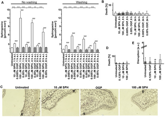 - Fischer, C.L.; Walters, K.S.; Drake, D.R.; Blanchette, D.R.; Dawson, D.V.; Brogden, K.A.; Wertz, P.W. Sphingoid bases are taken up by Escherichia coli and Staphylococcus aureus and induce ultrastructural damage. Ski. Pharmacol. Physiol. 2013, 26, 36–44. [Google Scholar] [CrossRef] [PubMed]