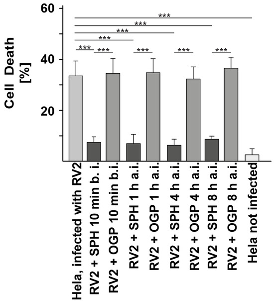 Sphingosine prevents infections with rhinovirus in vivo. Mice were intranasally infected with 103 plaque-forming units (PFU) rhinovirus strain 2 (RV2) in 10 μL phosphate-buffered saline (PBS). Sphingosine (SPH) was applied into the nose of wildtype mice as a 100 μM suspension in PBS/octylglucopyranoside at a volume of 10 μL. Sphingosine was applied 10 min before rhinovirus infection (b.i.) and/or 1, 2, 3, 4, or 8 h after infection (a.i.). Controls received the solvent ocytylglucopyranoside (OGP) at the same concentration as that used when sphingosine was applied or were infected but left untreated or were left uninfected and untreated. Mice were sacrificed after 24 h. The mucosa was removed, cells were isolated and co-incubated with HeLA cells. Infection was analyzed by a bioassay measuring the cytopathic effect of the virus on HeLa cells after the release of the virus from nasal epithelial cells. The percentage of dead cells ± SD from 4 independent experiments is given. *** p < 0.001; ANOVA.