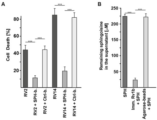 Next, we elucidated the mechanisms by which sphingosine prevents infection with rhinovirus. To this end, we incubated RV2 and RV14 with sphingosine that was pre-bound to agarose beads or with control beads alone and determined the degree to which the virus was bound to sphingosine. The results showed that sphingosine-coupled agarose beads efficiently bind RV2 or RV14 and almost completely deplete the supernatant from any virus (Figure 4A). Similarly, we immobilized rhinovirus type 1b (RV1b) by immunoprecipitating it with a specific antibody and agarose beads and determined whether sphingosine bound to the virus. The results showed that the virus binds sphingosine with high effectiveness (Figure 4B). Controls that measured a potential release of sphingosine from the beads confirmed that sphingosine stably bound to the beads and the amount released from the beads in in the presence or absence of Rhinovirus was below the detection level of 10 pmol.