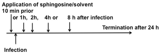 Mice were infected with 103 PFU RV2 in 10 μL PBS. The virus was applied directly into the nose with a blunt-ended, plastic-coated 30G needle, which was inserted approximately 2 mm into the nose. Sphingosine was applied into the nose of wildtype mice at a concentration of 100 μM in PBS at a volume of 10 μL. Sphingosine was diluted in 0.9% NaCl as described above. Sphingosine was applied either 10 min before rhinovirus infection or 1, 2, 3, 4 or 8 h after infection. Control animals were treated with the solvent, octylglucopyranoside, at the same concentration as that used when sphingosine was applied or were infected but left untreated. Mice were sacrificed after 24 h (Figure 6). The nasal bone with the nasal tissue was removed and incubated for 4 days with HeLa cells in a 24-well plate. If nasal epithelial cells are infected, rhinovirus is released because of the cytopathic effect of the virus, and the in vivo infection can then be determined and quantified by measuring the cell death of HeLa cells as a bioassay. Cell death was determined by Trypan Blue as described above by counting at least 500 cells per sample.