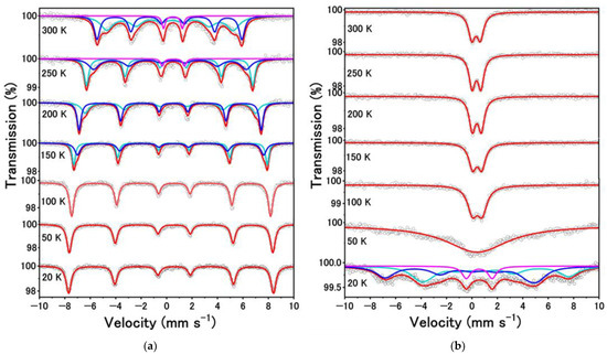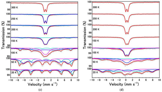 Where Vxx, Vyy, and Vzz (=eq) are the electrical field gradient on the x, y, and z axis, with the order of |Vzz| > |Vyy| > |Vzz|. As for the sextet observed for α-Fe2O3, the ∆ value is determined by subtracting the width between 5th and 6th from that between 1st and 2nd. As a result, the ∆ value of α-Fe2O3 increased from −0.227 to 0.458 mm s−1 with a decrease in temperature from 300 to 20 K. In particular, the symbol of ∆ changes from negative to positive between 260 and 240 K because of the Morin transition [36].