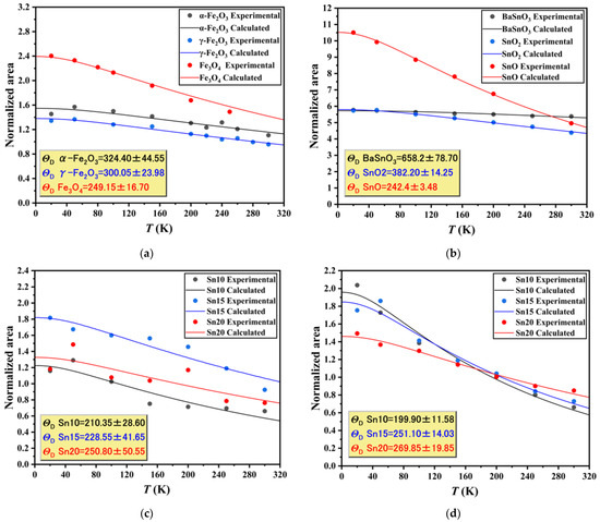 The temperature dependency of the normalized absorption area (A(T)/A(20 K)) in the 57Fe-Mössbauer spectra of iron oxides and α-SnxFe1−xOOH NPs are shown in Figure 3a,c. The f value decreased from 100% to 76, 71, and 61% for α-Fe2O3, γ-Fe2O3, and Fe3O4 when the 57Fe-Mössbauer spectra were measured from 20 to 300 K, as shown in Figure S5. By using Equation (8), the ΘD values were determined at 324, 300, and 249 K, respectively. It can be understood that the largest ΘD value of 324 K of α-Fe2O3 is the largest because of the large coordination number of 6 and that the smaller ΘD value of 300 K for γ-Fe2O3 was obtained because of the smaller coordination number of 4 with the defective structure. Further, the smaller ΘD of 249 K was obtained for Fe3O4 because it contains a mixed valence state of Fe2+ and Fe3+ with the vacant sites [45,46].