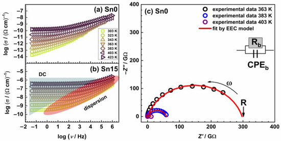 Although the conductivity isotherms are similar in shape for different samples and at different temperatures, overall, two different spectral features can be identified. The first one is a nearly frequency-independent conductivity related to the long-range transport of charge carriers which corresponds to DC conductivity or the overall resistance and can be observed at low frequencies. The second one is the frequency-dependent part, commonly referred to as conductivity dispersion, which occurs with increasing frequency in the form of a power-law and is related to localized short-range motions of charge carriers. One can see that the change from DC to the dispersion region shifts with an increase in temperature to higher frequencies (Figure 4a,b). For the lower-conducting sample, Sn0, DC plateau is not observed at lower temperatures, due to our experimental frequency window, and the conductivity is strongly frequency-dependent.